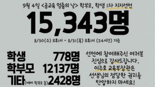 부산에서는 한 학부모 제안으로 시작된 9월 4일 공교육 멈춤의 날 지지 호소문에 1만 5000명이 응답했다. 공교육 멈춤의 날(공교육 정상화의 날)과 관련해 학부모·학생들이 시작한 지지 선언이 하루 만에 1만 5000여 명을 넘어선 것이다.