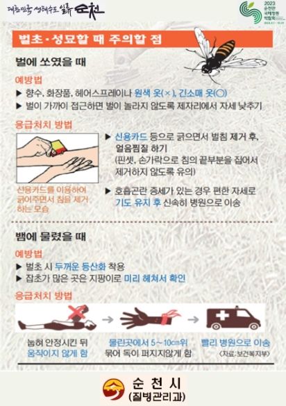 노관규 순천시장은 “매년 9월부터 10월까지 가을철에는 추석 벌초나 성묘 등을 위한 야외활동과 여행, 캠핑 등을 위한 나들이가 많은 만큼 뱀과 벌, 진드기 등에 물려 발생하는 안전사고도 상대적으로 많이 발생한다”라면서, “시민들이 야외 농작업이나 산행 등을 하실 때 가능한 피부가 노출되지 않도록 안전 수칙 준수에 단단히 신경을 써 달라”라고 당부했다.