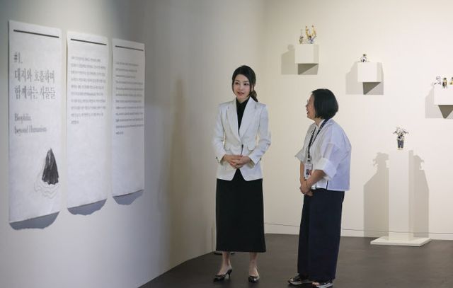 대통령실에 따르면, 김 여사는 발달장애 예술인이 참여한 특별 워크숍에서 제작된 도자기 전시를 둘러봤으며 황란 작가의 ‘또 다른 자유_FB’, 아리 바유아지 작가의 ‘바다를 엮다’ 등 국내외 여러 작가들의 작품을 관람했다.