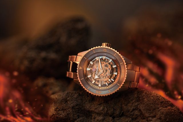 라도의 대표적 컬렉션으로 빈티지 시계의 새로운 지평을 연 캡틴 쿡이 돌아왔다. 캡틴 쿡 하이테크 세라믹 스켈레톤은 그동안 라도가 개발한 노하우와 기하학, 경이로운 대비를 느낄 수 있는 워치를 대변한다. 케이스 전체를 하나의 블록으로 만든 모노블록 형태이며 케이스 지름 43mm, 두께 14.6mm로 플라스마 하이테크 세라믹 베젤 인서트가 감싸고 있다. 한 방향으로 회전하는 베젤 프레임에는 PVD 코팅 처리한 로즈 컬러 인덱스 링을 사용했으며, 스크루다운 크라운 역시 같은 컬러를 매치해 케이스와 대비되는 효과를 강조한다. 인덱스와 핸드는 화이트 슈퍼루미노바로 코팅했으며 내부에는 최대 80시간 파워리저브 기능을 갖춘 라도의 새로운 오토매틱 칼리버 R808 스켈레톤 무브먼트를 탑재했다. 정확성이 뛰어난 니바크론 헤어스프링을 장착해 높은 항자성을 보장하며, 크라운은 기존 세 가지 포지션에서 다섯 가지 포지션으로 다양한 방향에서 조정할 수 있게 해 정밀성을 높였다. 새로운 수평 브러시트 지지판과 로즈 컬러 미닛 휠 브리지를 포함해 다양한 컬러 대비는 물론, 더욱 넓어진 다이얼 창을 통해 내부를 선명하게 확인할 수 있다. 더불어 투명한 사파이어 크리스털의 원형 브러시트 티타늄 백케이스로 무브먼트의 또 다른 면을 볼 수 있다. 브레이슬릿 역시 플라스마 하이테크 세라믹을 사용했으며 바깥쪽 링크는 무광, 가운데 링크는 유광으로 마감 처리했다. 티타늄 트리플 폴 버클과 특수 합금 세라모스™로 제작한 푸시 버튼을 더해 변치 않는 아름다움을 완성했다.