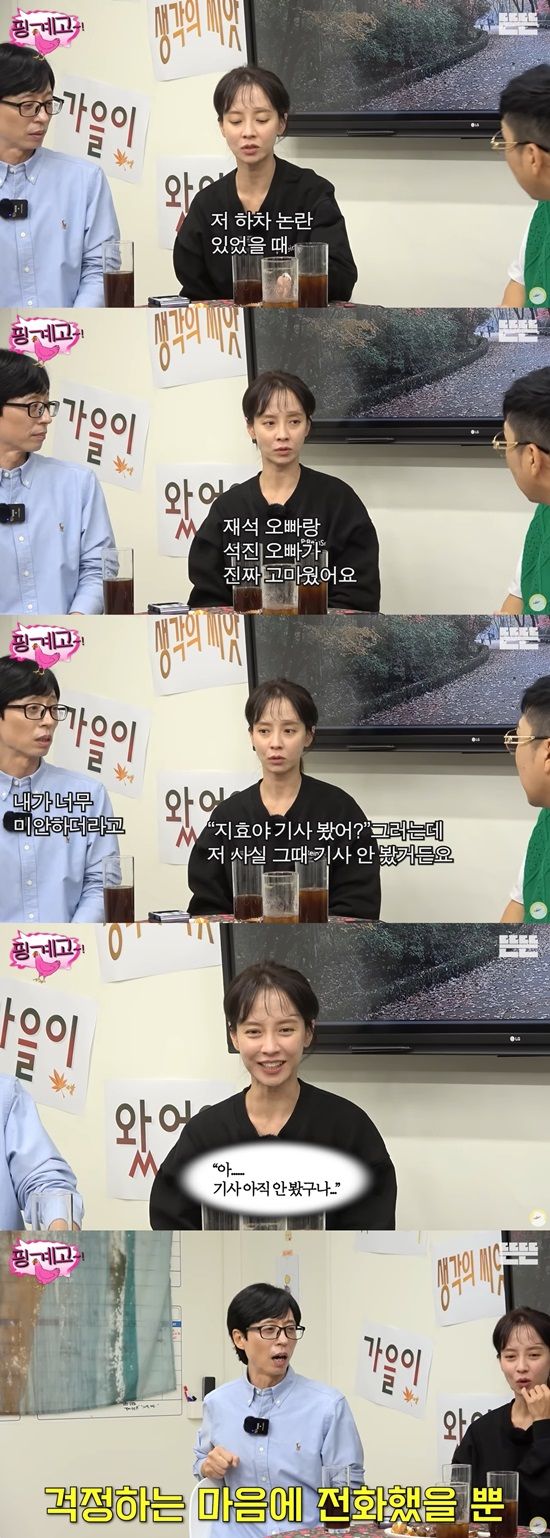 송지효는 "검색도 하지 말고 그냥 있으라고 했는데, 하지 말라니까 더 궁금하더라"고 덧붙였고, 유재석은 "얘 또 마음 약한 앤데, 그래서 전화를 한 거다"며 "그런데 얘가 '오빠' 하더라. '기사를 안 본 건가', '본 거 같은데', '일부러 밝은 척 하는 건가' 하면서 수많은 생각이 들더라"고 당시 상황을 회상했다.