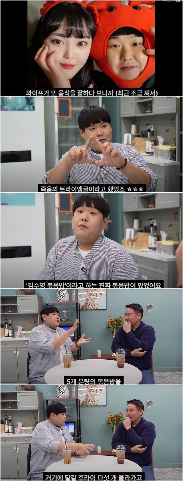 김수영은 "그때 식사량이 어느 정도였냐면 라면 10개, 공깃밥 5개 말아 먹었다. 개그콘서트 선배들과 자주 시켜 먹는 중국집이 있었다. '김수영 볶음밥'이 있었다. 5개 분량의 볶음밥을 탕수육 그릇에 담아서 달걀프라이 5개 올린 거다. 그걸 혼자 다 먹었다"고 밝혔다.