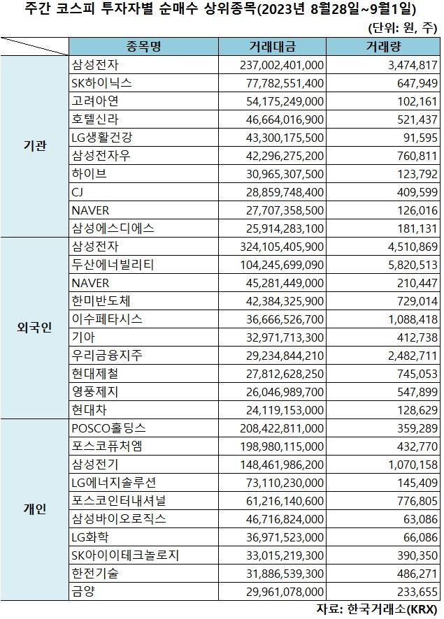 기관 '삼성전자'·외인 '삼성전자'·개인 'POSCO홀딩스' 1위 [주간 코스피 순매수- 8월28일~9월1일]