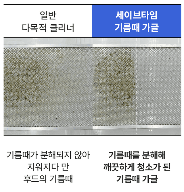 바로 세이브타임의 '기름때 가글'이다. 주방의 후드 기름때 제거에 특히 탁월한 효과를 볼 수 있는 제품으로 알려져 있으며 뿌리고 닦기까지 5분 만에 주방 기름때를 손쉽게 제거할 수 있다. (바로가기)
