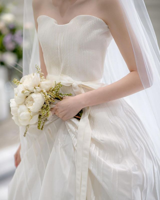 이들의 웨딩화보와 결혼식 현장 사진도 시선을 사로잡는데요. 하객들을 향해 미소 가득 인사를 건네다가도 벅찬 감동에 사로잡힌 두 사람의 모습이 아름답네요. 플리츠 디테일이 인상적인 김수빈의 본식 드레스는 다니엘 프랑켈 제품입니다. 공효진이 뉴욕 결혼식 당시 입었던 엠파이어넥 드레스와 같은 브랜드군요.