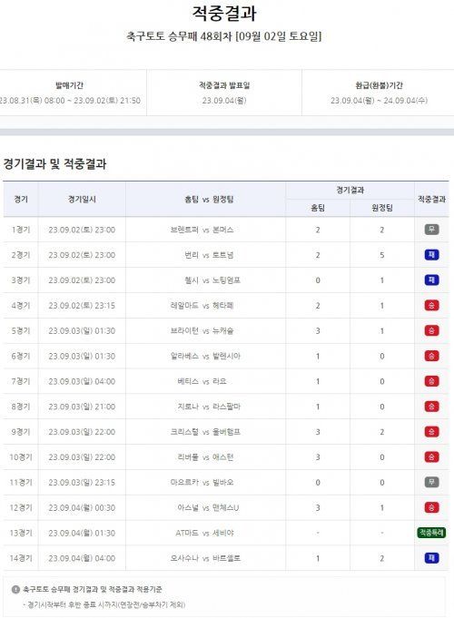국민체육진흥공단에서 발행하는 체육진흥투표권 스포츠토토의 수탁사업자 스포츠토토코리아가 지난 2일(토)부터 4일(월)까지 진행된 잉글랜드 프리미어리그(EPL) 7경기 및 스페인 프리메라리가(라리가) 7경기 등 총 14경기를 대상으로 실시한 축구토토 승무패 48회차 게임에서 1등 적중 건수가 총 48건이 발생했으며, 적중금은 약 30억 원에 달한다고 밝혔다.