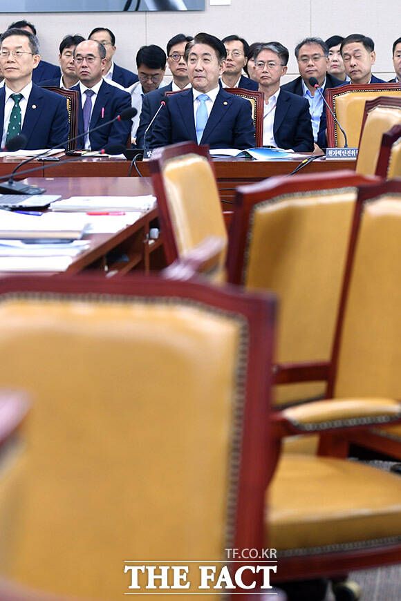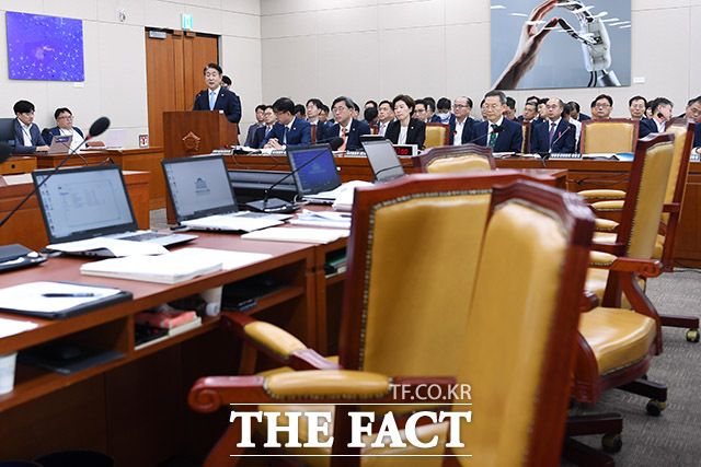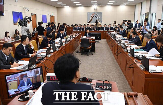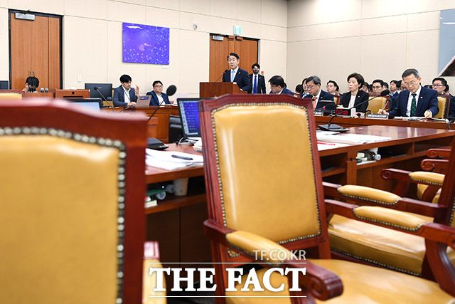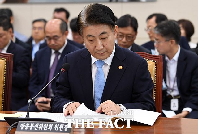 [더팩트ㅣ국회=남용희 기자] 이동관 방송통신위원회 위원장(왼쪽)이 4일 오전 서울 여의도 국회에서 열린 과학기술방송통신위원회(과방위) 전체회의에서 제안설명을 하고 있는 가운데 더불어민주당 의원들이 퇴장해 자리가 비어있다.