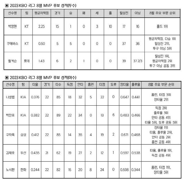 투수 중에서는 박영현, 쿠에바스(이상 KT), 윌커슨(롯데), 야수 중에서는 나성범, 박찬호(이상 KIA), 구자욱(삼성), 김재호(두산), 노시환(한화)이 후보로 선정돼 8월 MVP 자리를 두고 치열한 경쟁을 벌인다.