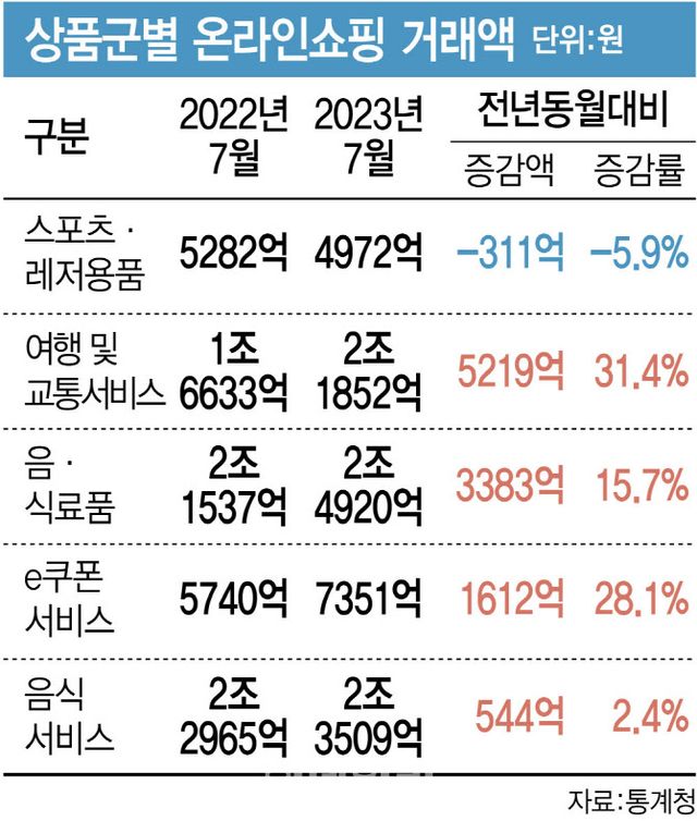 음식서비스는 올 여름 강수량이 많았던 게 배달 수요 증가로 이어지며 2.4%(544억원) 늘어난 2조3509억원으로 집계됐다. 반면 스포츠·레저용품은 궂은 날씨 탓에 대외 활동이 줄어들어 5.9%(311억원) 감소한 4972억원으로 나타났다.