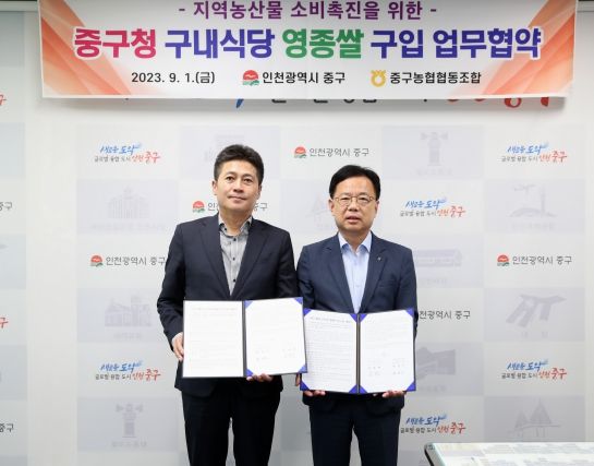 인천시 중구와 중구 농업협동조합은 지난 1일 제2청 구청장실에서 영종 쌀 소비 촉진과 구내식당 급식 수준 향상 등 지역 상생 협력을 위해 ‘2청 구내식당 영종쌀 구입 업무협약’을 체결했다.