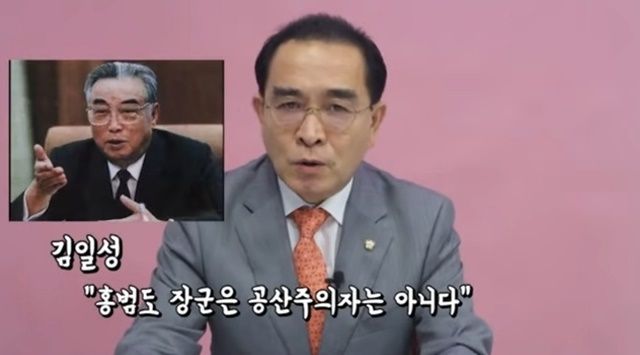 북한 외교관 출신 태영호 국민의힘 의원은 2021년 8월 24일 자신의 유튜브 채널에 올린 영상에서 "한국에서 일부 사람들이 홍범도 장군의 공과를 가리면서 그가 소련 공산당에 입당한 경력이 있으므로 좌익계 독립운동가라고 하지만 김일성은 '홍 장군이 공산주의자가 아니다'라고 평가했다"고 말했다. /태 의원 유튜브 채널 갈무리