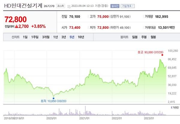 2023년 9월 4일, HD현대건설기계 주가가 올랐습니다. 해외 대형 건설 현장에 쓰일 장비를 연달아 수주했다는 소식에 투자자들이 관심을 보인 영향으로 풀이됩니다.
