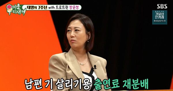 이날 장윤정은 도경완과 서로 통장 오픈을 한 적 없다고 밝혔다. 장윤정은 "나는 남편이 얼마나 버는지 모르고, 남편도 내 통장을 본 적이 없다"라며 "다만 스케줄 표는 공유하는데, 내 출연료를 얼추 아니까 곱하고 있는 것"이라고 말해 웃음을 안겼다.