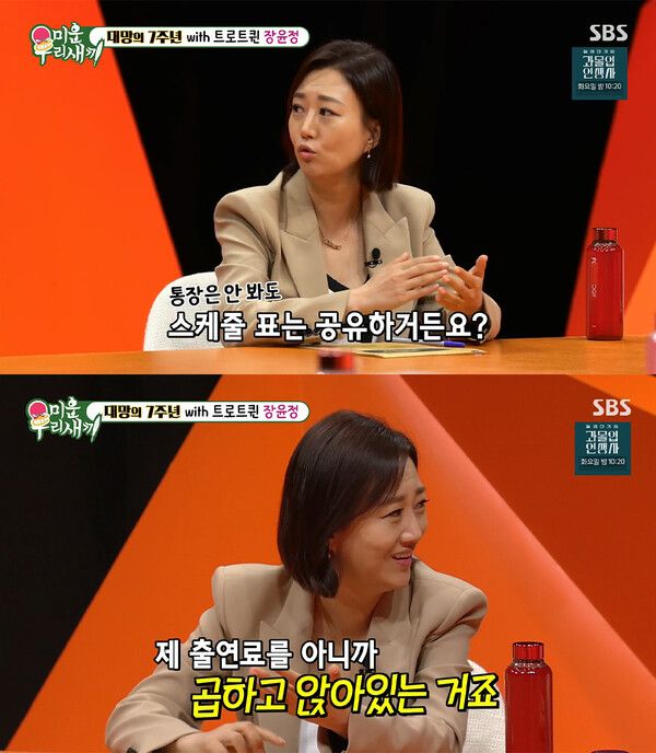 그러면서 출연료와 관련된 비화도 밝혔다. 장윤정은 "같이 한 프로그램에 출연한 적이 있는데 둘 사이에 출연료 차이가 있었던 거다. 그건 어쩔 수 없는 일인데도 내 마음이 불편하더라"라고 말했다.