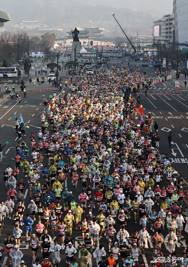 지난 3월19일 열린 2023 서울마라톤 겸 제93회 동아마라톤 출발 모습. 이날 대회에는 전문선수 101명을 비롯해 국내외 3만8000여 명의 마라토너들이 레이스에 참가해 서울의 거리를 힘차게 달렸다. 스포츠동아 DB