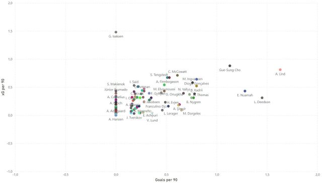 이를 뒷받침하는 근거로, 축구 데이터 분석가 크리스토퍼 저스는 SNS에 덴마크 수페르리가 공격수들의 90분당 득점과 기대득점(xG)을 표로 만들어 정리했다. 기대득점은 슈팅 기회가 득점으로 연결될 확률로, 기대득점 값이 높을수록 결정적인 기회를 남들보다 많이 가졌다는 걸 의미한다.