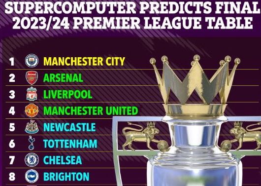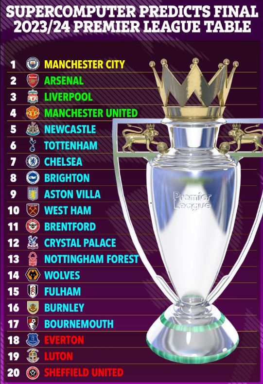 더선이 공개한 슈퍼컴퓨터의 순위에 따르면 1위는 맨시티, 2위 아스널, 3위는 리버풀이 차지할 것이라고 예상됐다. 남은 챔피언스리그행 티켓 한 장은 맨유의 몫이라고 판단했다. 5위는 뉴캐슬이며, 토트넘은 6위로 시즌을 마감할 것이라고 슈퍼컴퓨터는 예측했다.