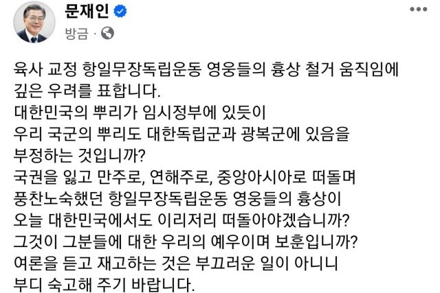 문 전 대통령은 최근 현안에 대해 비교적 긴 메시지를 내고 있다. 문 전 대통령은 지난달 27일 육군사관학교 교정의 홍범도·김좌진·지청천·이범석 장군과 우당 이회영 선생 흉상 이전 추진 움직임에 대해 "깊은 우려를 표한다"며 재고를 요청했으며, 같은 달 24일에는 "나는 일본의 오염수 방류를 반대한다. 또한 이 문제에 대한 정부의 대응이 아주 잘못됐다고 생각한다"고 밝혔다.