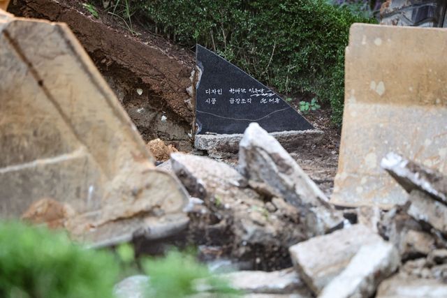 5일 오전 서울 중구 남산 일본군 위안부 기억의 터에 위치한 '대지의 눈' 철거 현장에 임옥상 화백 이름이 적힌 조각이 남아있다.