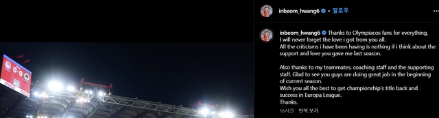 그러나 팬들은 우여곡절 끝에 올림피아코스 떠나는 황인범의 작별 인사에 욕설로 응대해 충격을 주고 있다.