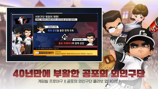 ‘겜프야 2023’은 이번 업데이트에 맞춰 ‘공포의 외인구단’ 테마로 탈바꿈한다. 게임 로비와 경기장이 새롭게 바뀌며, 신규 시나리오에는 ‘오혜성’과 ‘마동탁’이 주인공으로 등장한다. 오혜성과 마동탁은 지능과 근력 속성을 갖췄고 ‘공포의 외인구단’ 시나리오에서 특히 육성 효율이 높다. 해당 시나리오에서는 선수들의 훈련을 진행해 기여도를 쌓으면 특화 스킬이 열려 더욱 강력한 구단을 육성할 수 있다. 두 트레이너는 이달 26일까지 진행되는 ‘영입 확률 업’ 이벤트를 통해 수월하게 영입할 수 있다.