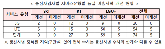 통신사업자별 서비스유형별 품질 미흡지역 개선 현황. ⓒ 과학기술정보통신부