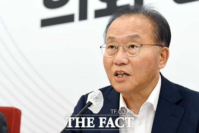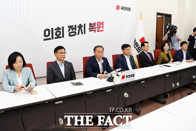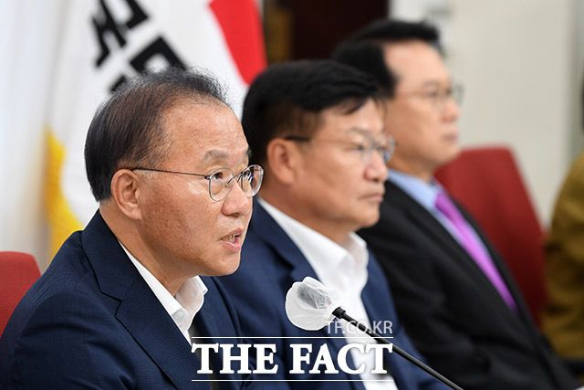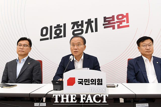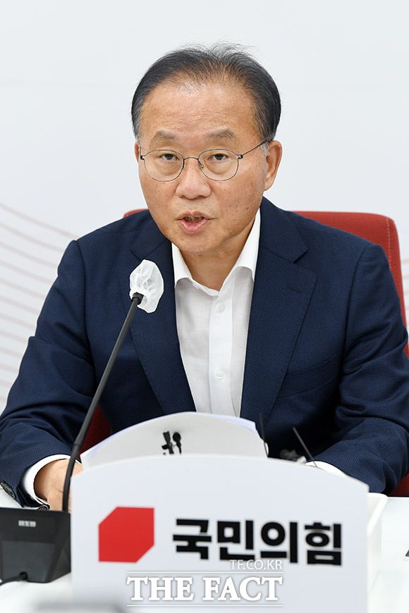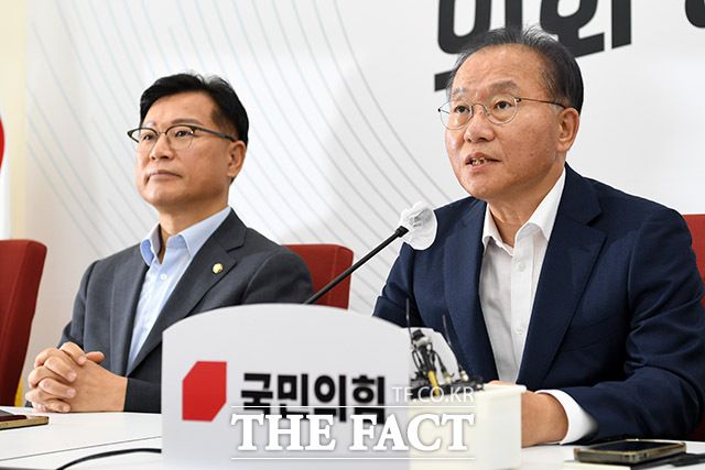 [더팩트ㅣ국회=남용희 기자] 윤재옥 국민의힘 원내대표(오른쪽)가 6일 오전 서울 여의도 국회에서 열린 '대선 공작 게이트' 대응 긴급 대책회의에서 발언을 하고 있다.