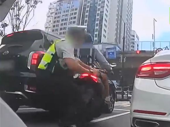 무등록 오토바이 운전자 A씨가 지난해 8월 27일 부산시 부산진구에서 경찰관을 매단 채 도주하려던 혐의로 징역 2년을 선고 받았다. [사진=유튜브 '한문철TV']
