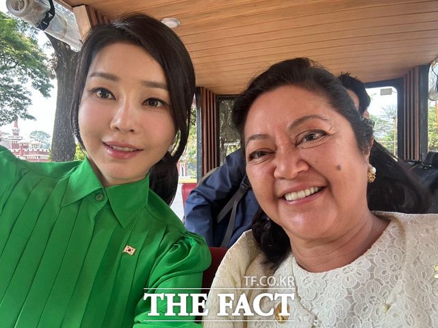 윤석열 대통령 부인 김건희 여사가 6일(현지시간) 아세안 정상회의 배우자 프로그램으로 자카르타 따만 미니 민속공원을 방문해 페르디난드 마르코스 주니어 필리핀 대통령 배우자와 대화를 나눴다. 두 정상 배우자는 셀카를 찍기도 했다. /대통령실 제공