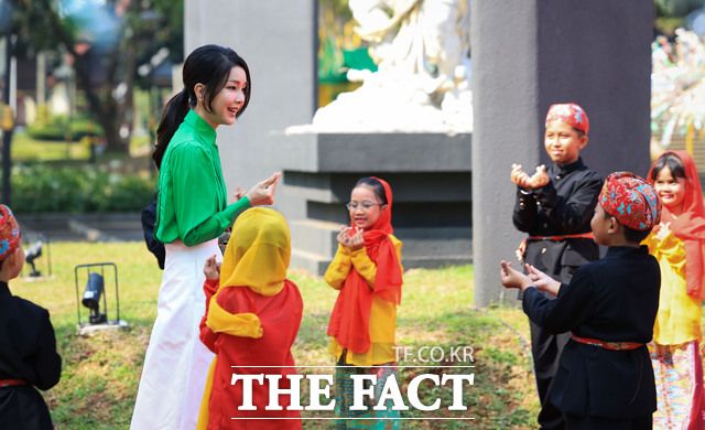 윤석열 대통령 부인 김건희 여사가 6일(현지시간) 아세안 정상회의 배우자 프로그램에 참여했다. 이날 자카르타 따만 미니 민속공원을 방문해 아이들과 함께 손하트를 하고 있다. /뉴시스