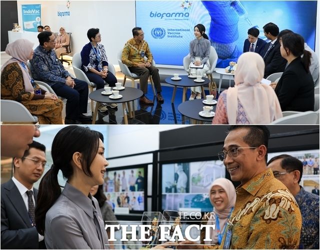 이어 오후에는 단독 일정을 소화했다. 김 여사는 인도네시아 국영 제약사인 바이오파마(Bio Farma)를 방문해 연구진과 담당 책임자들을 격려했다. 바이오파마는 한국에 본부를 두고 있는 국제백신연구소(IVI)와 장티푸스 백신 개발 및 보급을 위해 협력하고 있으며, 김 여사는 지난 3월 IVI 한국후원회 명예회장으로 추대된 바 있다.