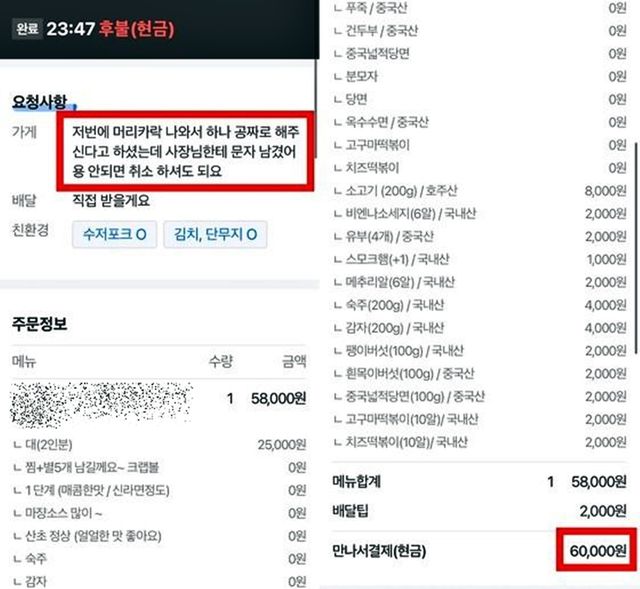 A씨는 "제가 해드린다고 했기 때문에 해드렸는데 기분이 좀 이상하다. 평소에는 1만원대 금액으로 주문 넣으시는데, 6만원이나 주문하셨다. 그것도 평소에는 추가하지도 않으시는 소고기부터 추가할 수 있는 재료는 다 추가했다"고 토로했다.