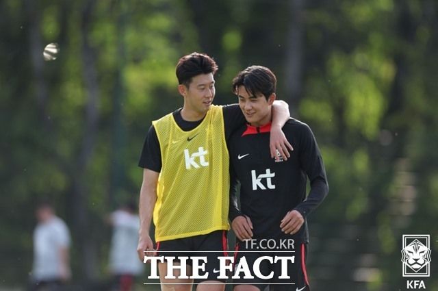 웨일스와 A내치를 앞두고 현지에서 훈련 중인 손흥민(왼쪽)과 수비수 설영우./KFA