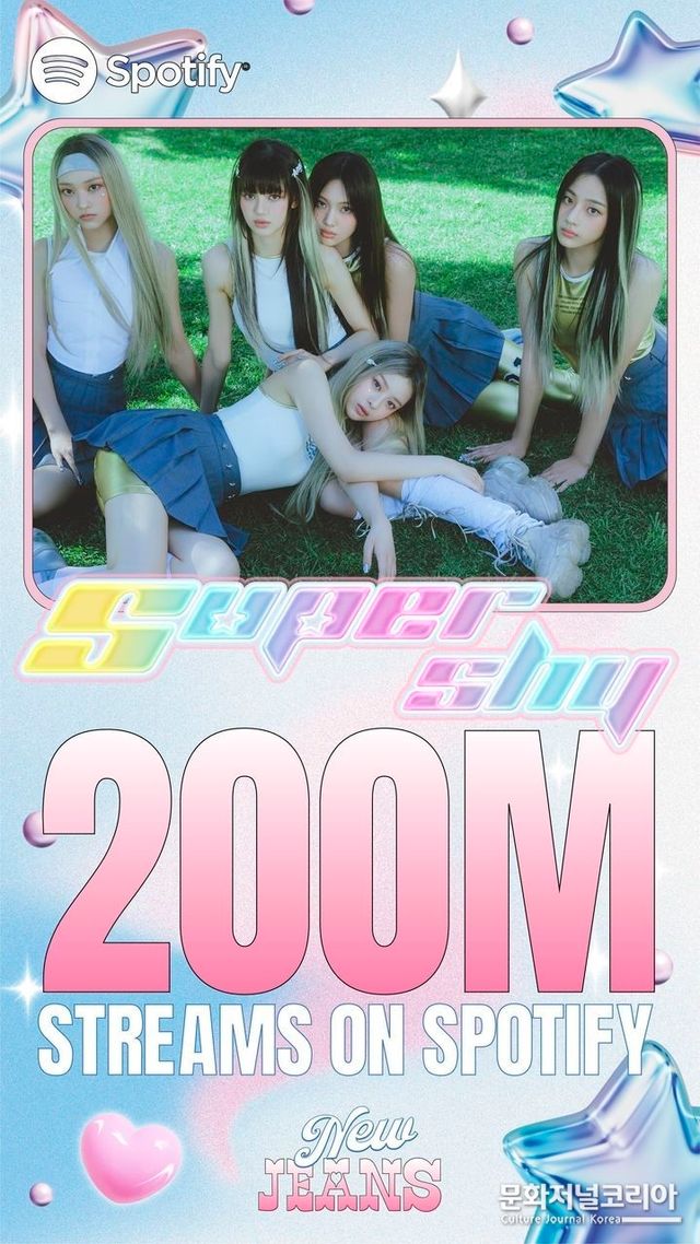문화저널코리아 김영일 기자 | 신드롬 걸그룹 '뉴진스(NewJeans)'의 히트곡 '슈퍼 샤이(Super Shy)'가 세계 최대 음원 플랫폼 스포티파이에서 2억 스트리밍을 돌파했다. 뉴진스 통산 다섯 번째 2억 스트리밍 곡이다.