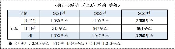지스타 2023 참가 신청 현황은 8월 31일 기준 3250부스(BTB관 2386 부스, BTB관 864부스)로 지난해 2947부스(BTC관 2100부스, BTB관 847부스) 대비 10% 가량 확대됐다. 참가 취소 등의 사유로 일부 변동이 발생할 수 있으나 지스타 2019의 3208부스를 넘은 역대 최대 규모의 개최가 확정됐다는 게 조직위의 설명이다.
