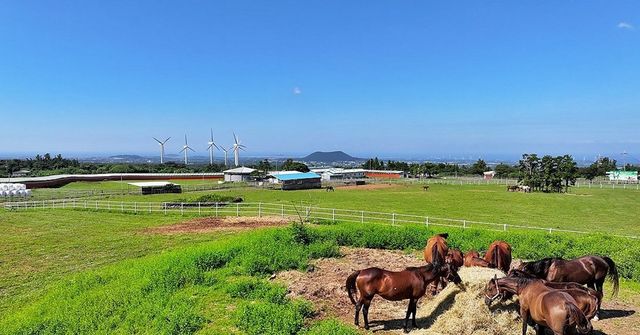 화창한 가을 날씨를 보인 7일 오전 제주시 한림읍 금악리의 한 목장에서 말들이 건초를 먹고 있다. /연합뉴스