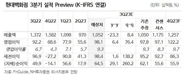 주 연구원은 "현대백화점의 올 3분기는 턴어라운드의 초입"이라고 예상했는데요. 3분기 연결기준 매출액과 영업이익은 각각 1조520억원(-23% y-y), 981억원(+6% y-y)으로 지난 3개 분기 연속 지속된 감익 추세를 벗어날 것으로 전망했습니다.