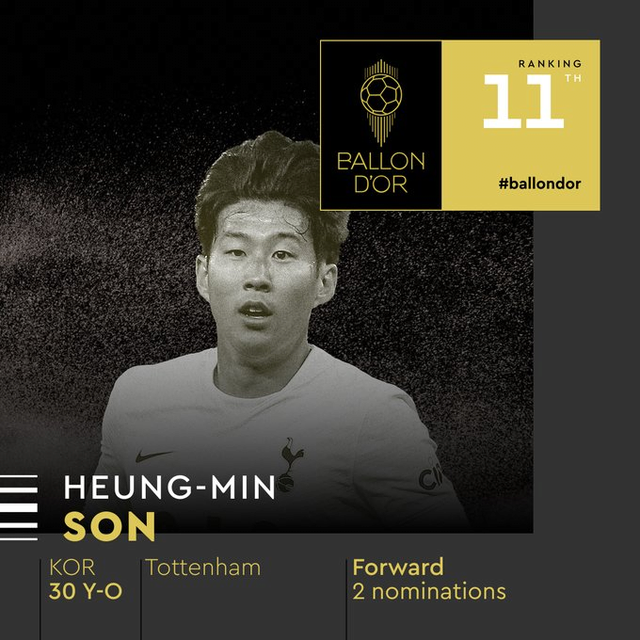 당시 22위를 기록한 손흥민은 3년 뒤 다시 30인 후보에 이름을 올렸다. 그는 2021/22시즌 프리미어리그에서 가장 많은 골을 넣은 득점왕이 됐다. 모하메드 살라(리버풀)와 함께 리그 23골을 기록한 그는 아시아 선수 최초의 프리미어리그 득점왕이라는 타이틀을 얻었고 아시아 최고 순위인 11위를 경신했다.