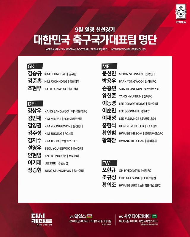 클린스만이 보도자료를 통해 발표한 대표팀에는 손흥민, 김민재, 황희찬 등 주축 멤버들이 대부분 선발됐다. 심지어 부상으로 컨디션 난조를 보였던 황희찬과 조규성, 오현규를 모두 불러들여 유럽 원정 2연전을 준비했다. 다만 회복까지 시간이 필요한 이강인과 김진수, 송범근 등은 제외됐다.