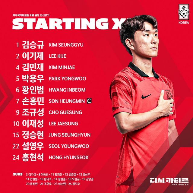대표팀은 이날 4-4-2 포메이션을 꺼내들었다. 김승규가 골문을 지켰고 이기제, 김민재, 정승현, 설영우가 수비를 맡았다. 황인범, 박용우, 이재성, 홍현석이 중원을 구성했으며 손흥민과 조규성이 최전방 투톱으로 호흡을 맞췄다. 황희찬과 황의조, 오현규, 양현준 등은 벤치에서 대기했다.