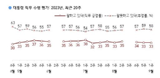 한국갤럽은 지난 5일부터 7일까지 전국 만 18세 이상 1000명을 대상으로 조사(9월 1주)한 결과 윤 대통령의 직무 수행 평가에서 ‘잘하고 있다’고 응답한 비율은 33%를 기록했다. 지난 조사(8월 5주)와 비교해 변동이 없었다.
