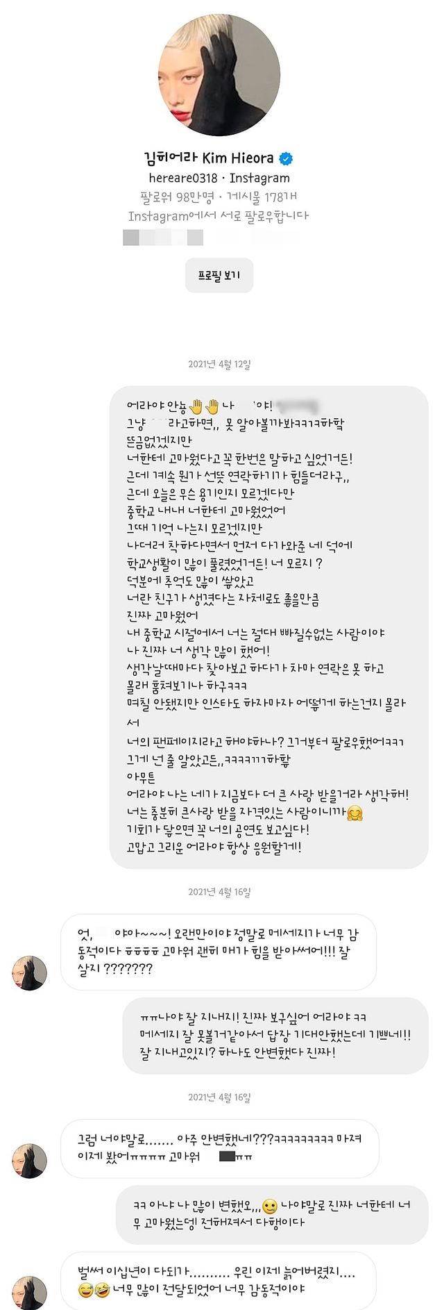다음은 글쓴이가 김히어라와 2021년에 나눈 인스타그램 디엠 대화 내용이다.