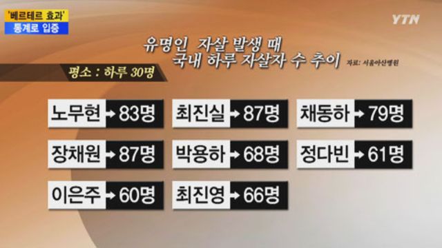 미국 연구 학자 데이비드 필리스(David Philips)는 유명인 극단적 사건이 언론에 보도된 이후 같은 선택을 하는 일반인의 증가하는 패턴을 발견했고 ‘베르테르 효과’라는 이름을 붙였다.