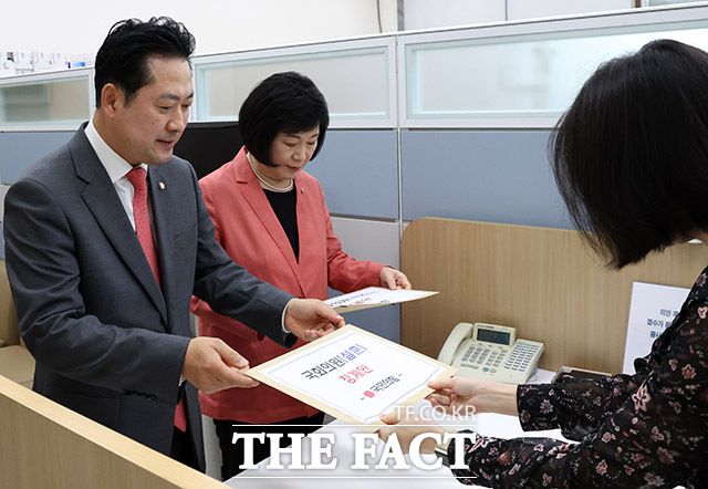 [더팩트ㅣ국회=남용희 기자] 장동혁 국민의힘 의원(왼쪽) 정경희 의원이 8일 오전 서울 여의도 국회 의안관에 대정부질문 중 '윤석열 대통령 탄핵'을 언급한 설훈 더불어민주당 의원과 태영호 의원에게 '막말'을 한 것으로 지목된 박영순 의원에 대한 징계안을 제출하고 있다.