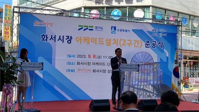 (뉴스영 김영식 기자) 이재준 수원시장이 8일 11시 화서시장의 아케이드 설치 준공식에서 축사를 하고 있다.