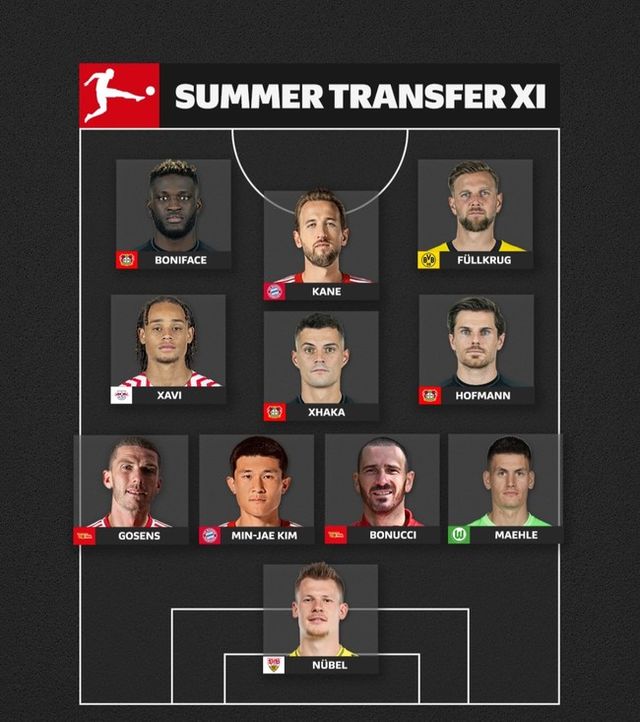 독일 분데스리가 공식 SNS는 7일(한국시간) 여름 이적시장 베스트 일레븐을 발표했다. 바이에른 뮌헨이 2명, 도르트문트가 1명, 레버쿠젠이 3명, 라이프치히가 1명, 우니온 베를린이 2명, 볼프스부르크가 1명, 슈투트가르트가 1명을 배출했다. 뮌헨 선수로 김민재와 해리 케인이 있었다.