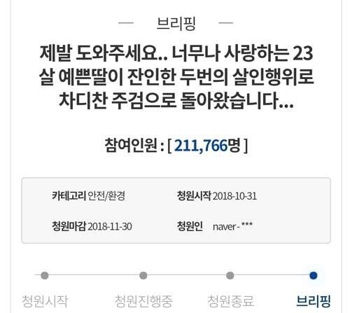 아울러 청원인은 “잔인하고 중대한 범죄에 대해 가해자의 얼굴 등 신상을 공개한다면 나 같이 피눈물 흘리는 엄마가 나오는 것을 막을 수 있을 것”이라며 “가해자를 이 사회와 영원히 격리하는 강력한 처벌이 이뤄질 수 있도록 간곡히 부탁드린다”고 밝혔다.