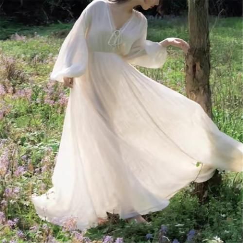 한국 한복 의상 화이트 레이스업 긴팔 드레스, 여성 홀리데이 의류, 우아한 이브닝 프렌치 파티, 가을 2023 신상 패션 원피스