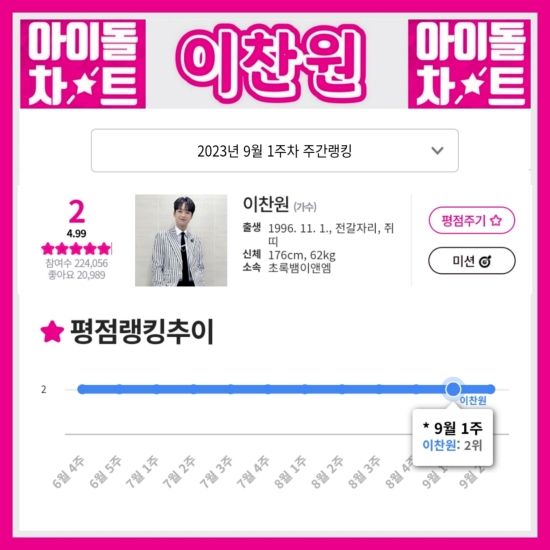 (엑스포츠뉴스 이정범 기자) '찬또배기' 이찬원이 9월 1주 차 아이돌차트 평점 랭킹 2위에 올랐다.