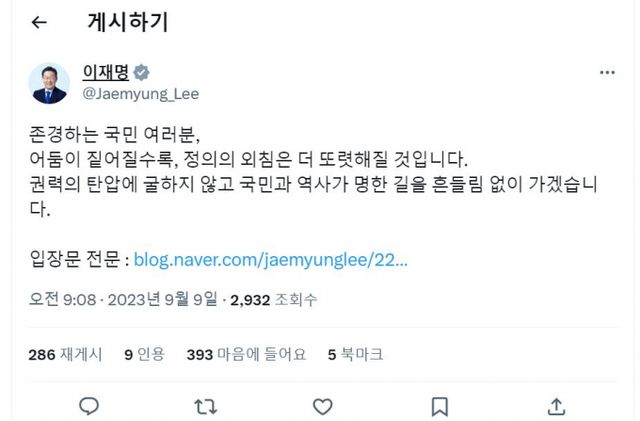 이 대표는 "어떤 가시밭길도 피하지 않겠다"며 "권력의 탄압에 굴하지 않고 국민과 역사가 명한 길을 흔들림 없이 가겠다"고 밝혔다.